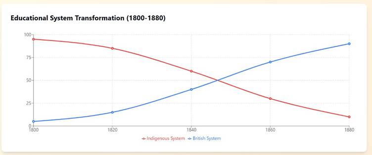 Fig: A graphic visualization of the decline of the indigenous schools between 1800-1880, following the policy shift advocated in Macaulay’s minute. Based on the data found in Dharampal’s pioneering work, “The Beautiful Tree” (graphic generated using Claude AI).